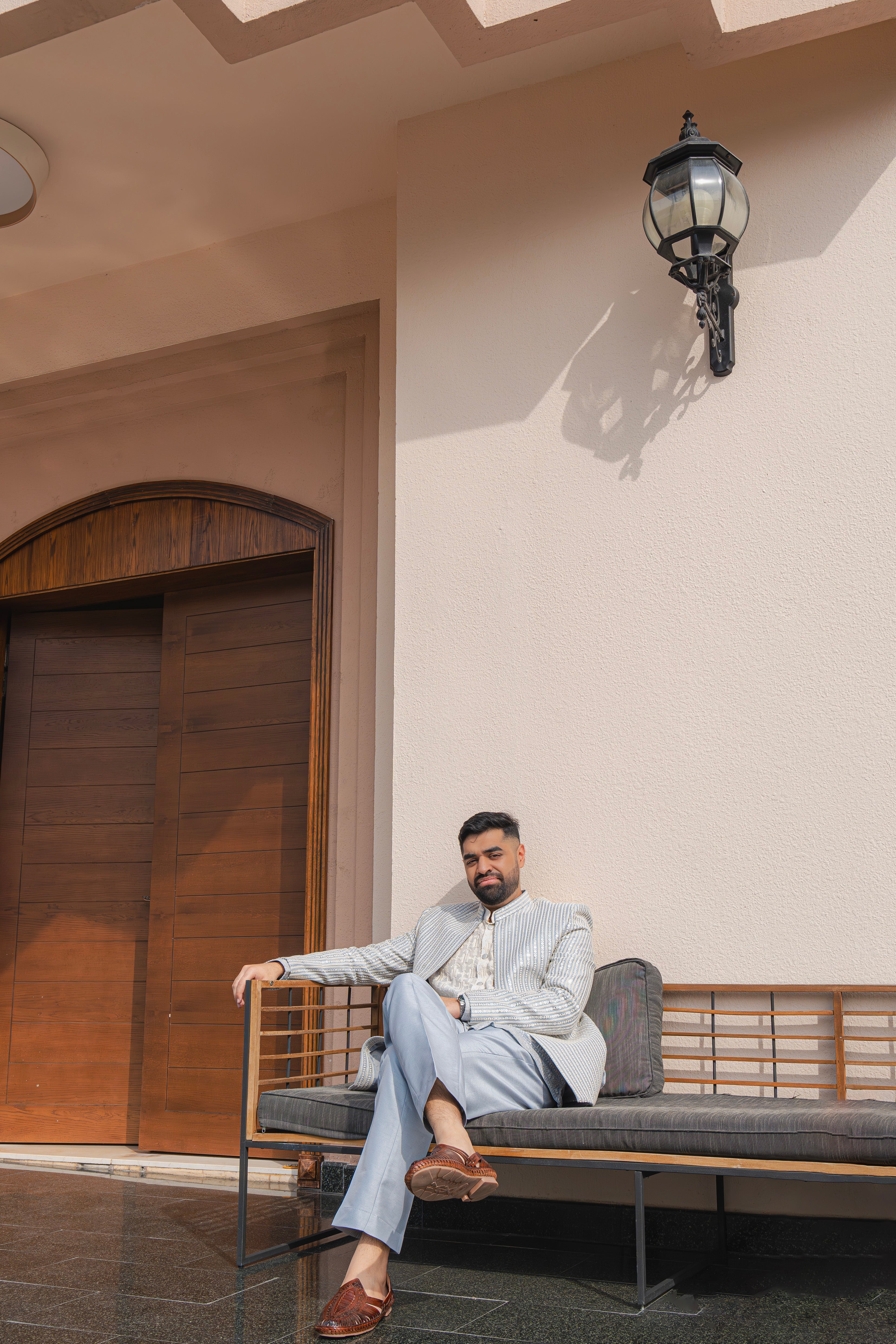 Paired with an ombré Lucknowi kurta adorned in delicate chikankari, this is where modern polish meets timeless craft. Finished with our handcrafted leather footwear for that final touch of finesse. Ideal for weddings, receptions, and festive gatherings.