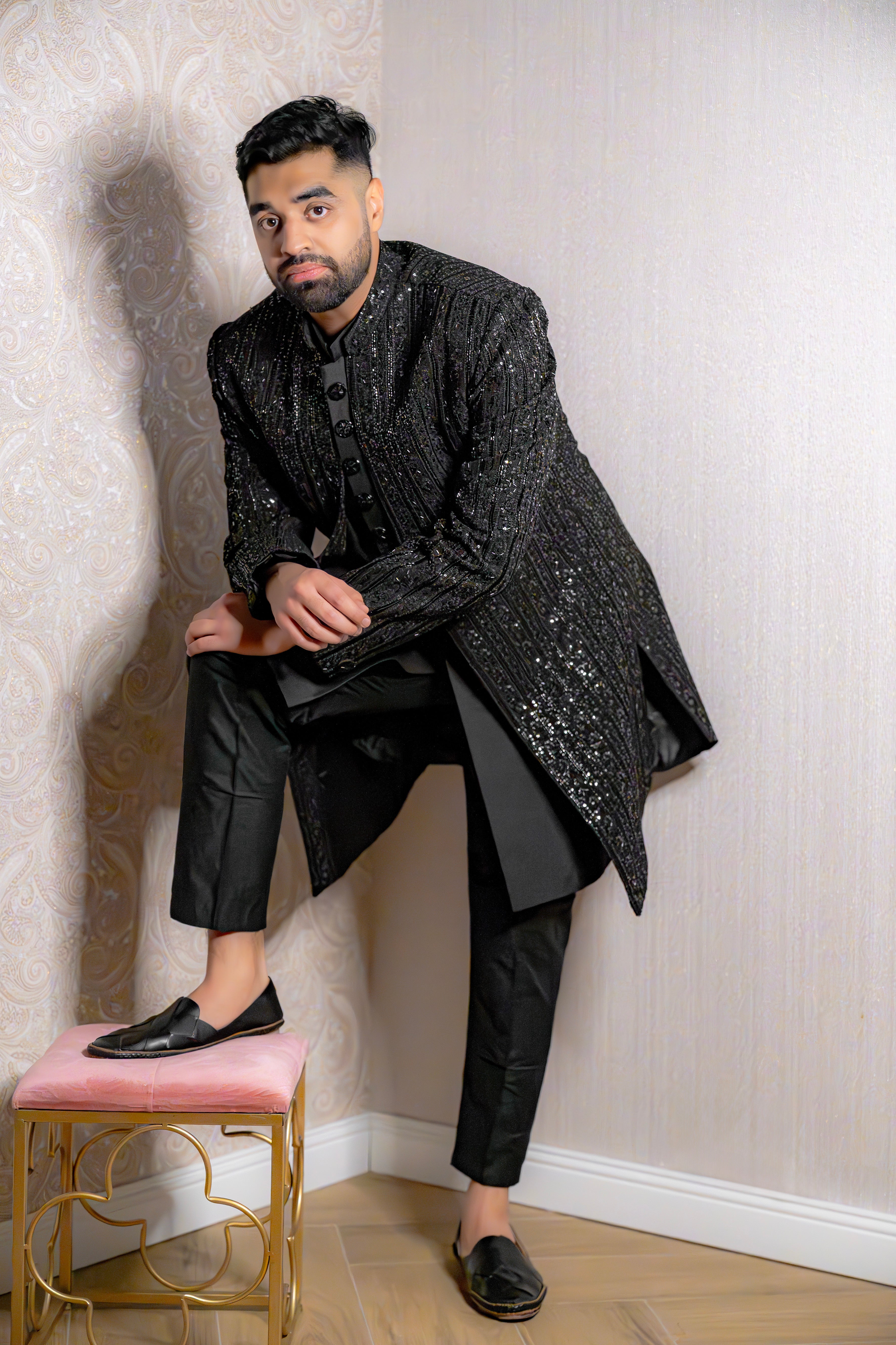 Black Shimmer Jacquard Indo-Western Sherwani Set
